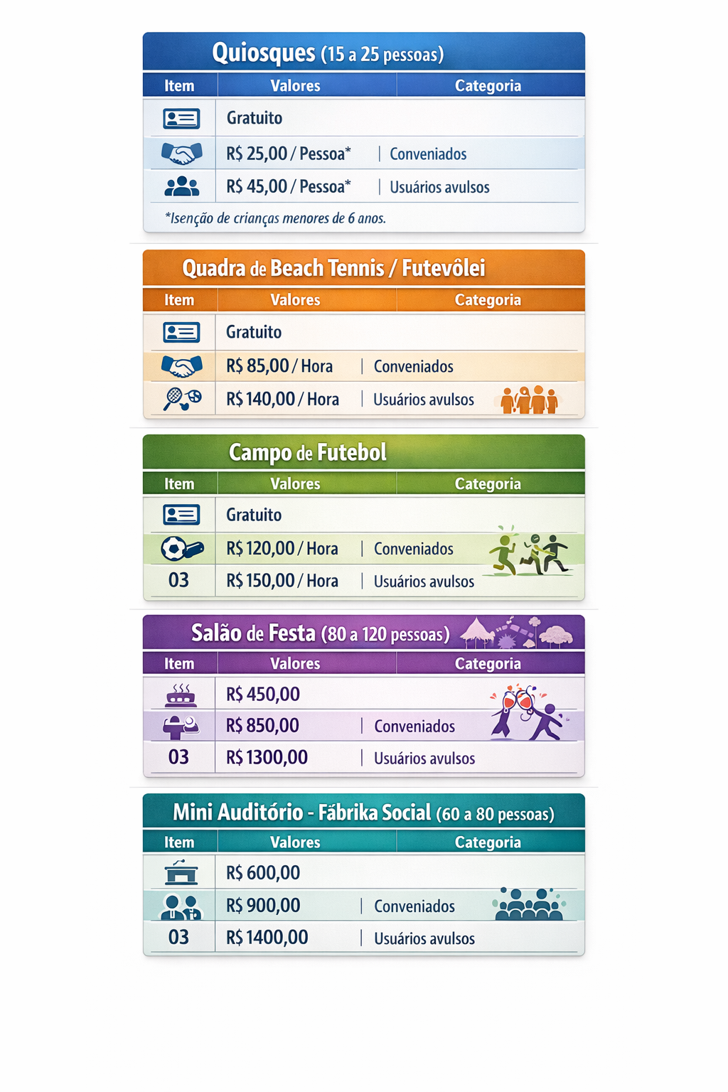 - Os pagamentos para uso dos espaços devem acontecer até 24 horas antes da utilização visando auxiliar a administração a sanar quaisquer eventualidades que ocorram;